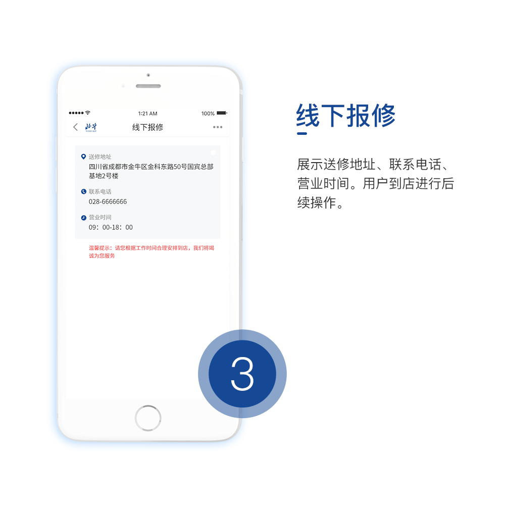 用戶可根據維修地點信息選擇到店進行產品維修,并可在手機查看后續(xù)維修進度