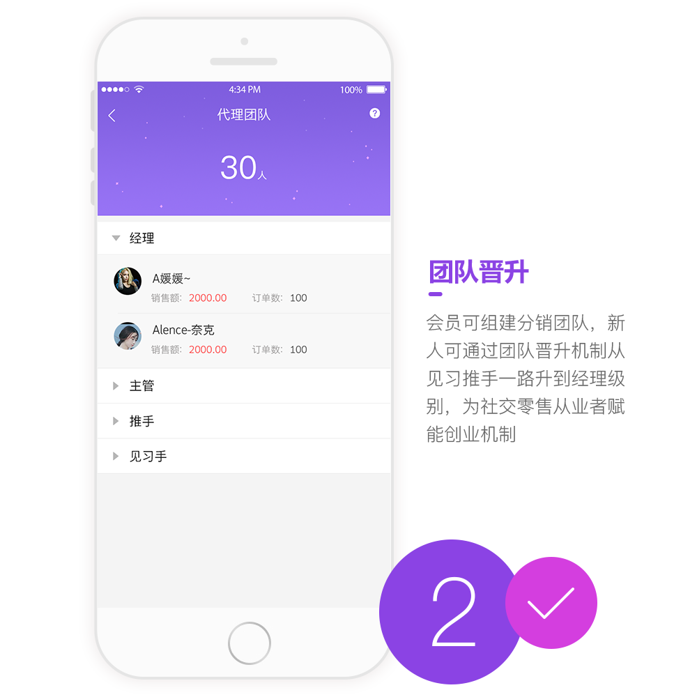 系統(tǒng)擁有完備的銷售返利晉升機制,用戶可快速發(fā)展自己的團隊,在平臺上實現(xiàn)社交零售創(chuàng)業(yè)的夢想。