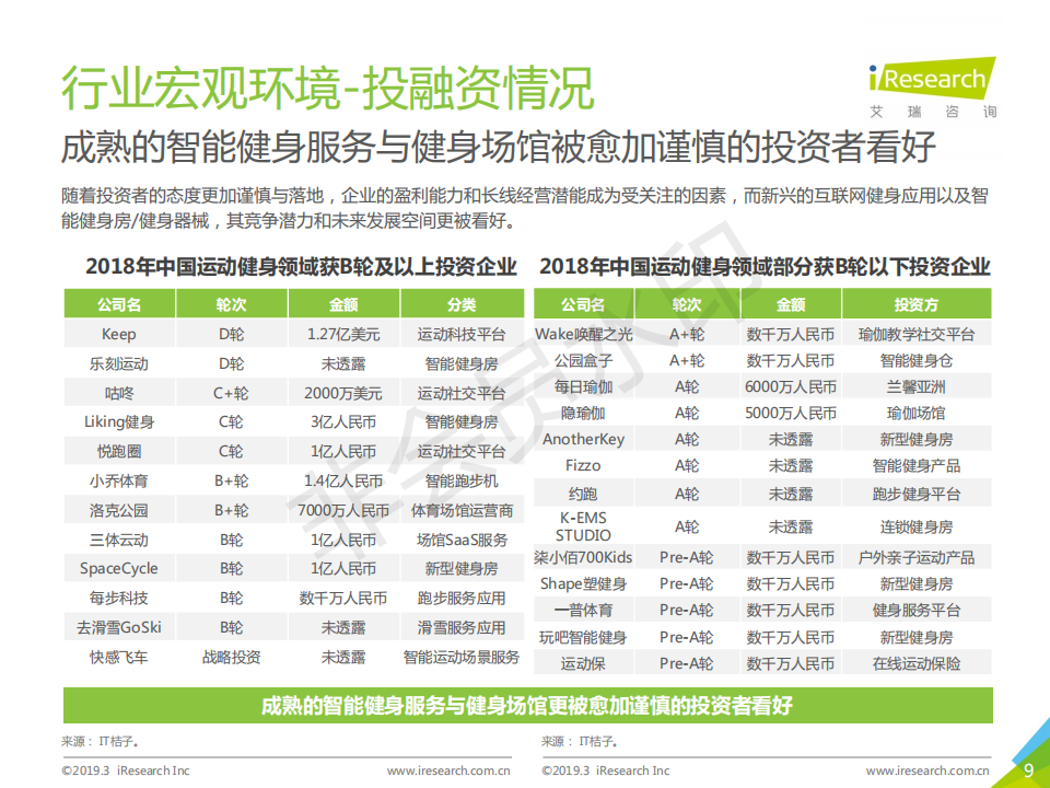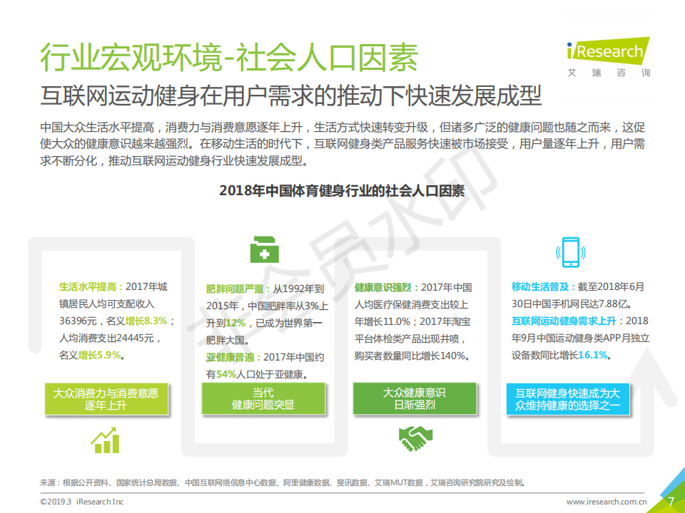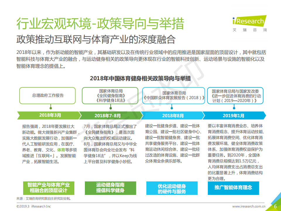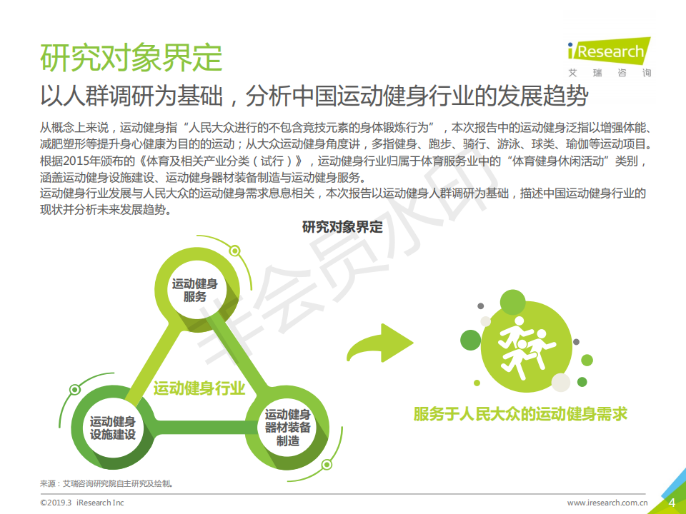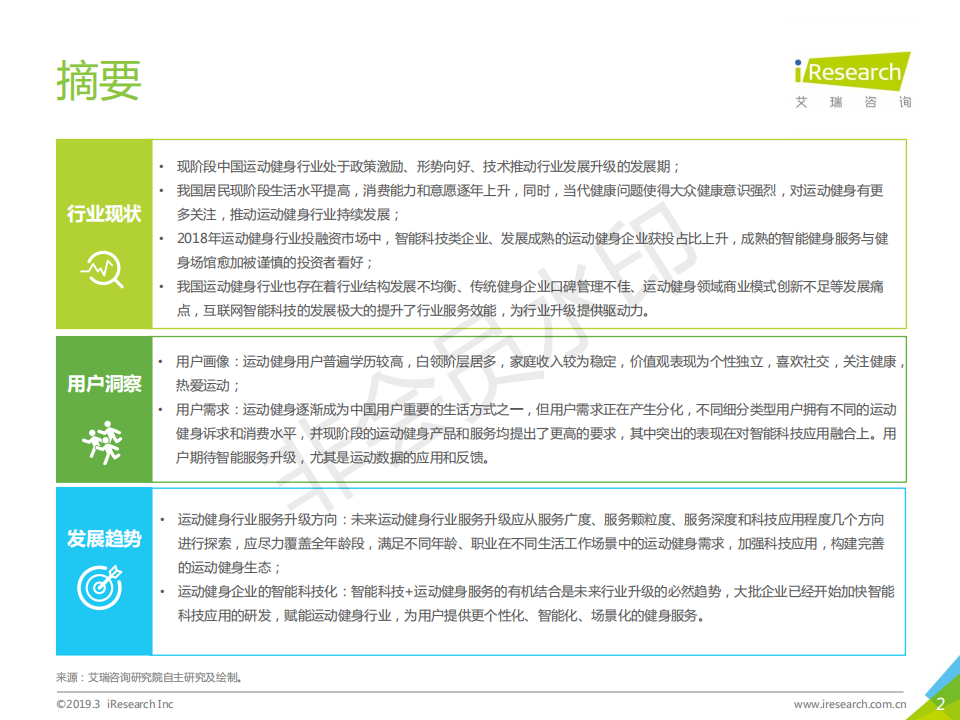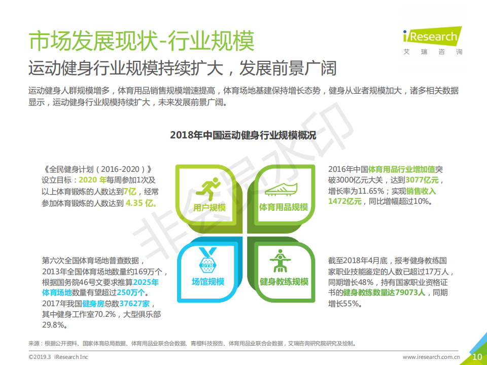 運動健身行業(yè)在政策鼓勵,大眾生活水平提升,健康意識提高的背景下,整體發(fā)展向好。2018年,傳統(tǒng)健身企業(yè)發(fā)展相對穩(wěn)定,資本看好穩(wěn)健型運動健身企業(yè)以及結(jié)合智能科技元素的新型運動健身企業(yè)。本報告以運動健身行業(yè)作為主要研究對象,描述并探討運動健身行業(yè)發(fā)展背景、現(xiàn)狀特點、產(chǎn)業(yè)鏈、商業(yè)模式,通過對運動健身人群的深入調(diào)研,探索其對運動健身場景、服裝設(shè)備、課程服務(wù)的服務(wù)需求,為未來行業(yè)服務(wù)升級提供發(fā)展建議。