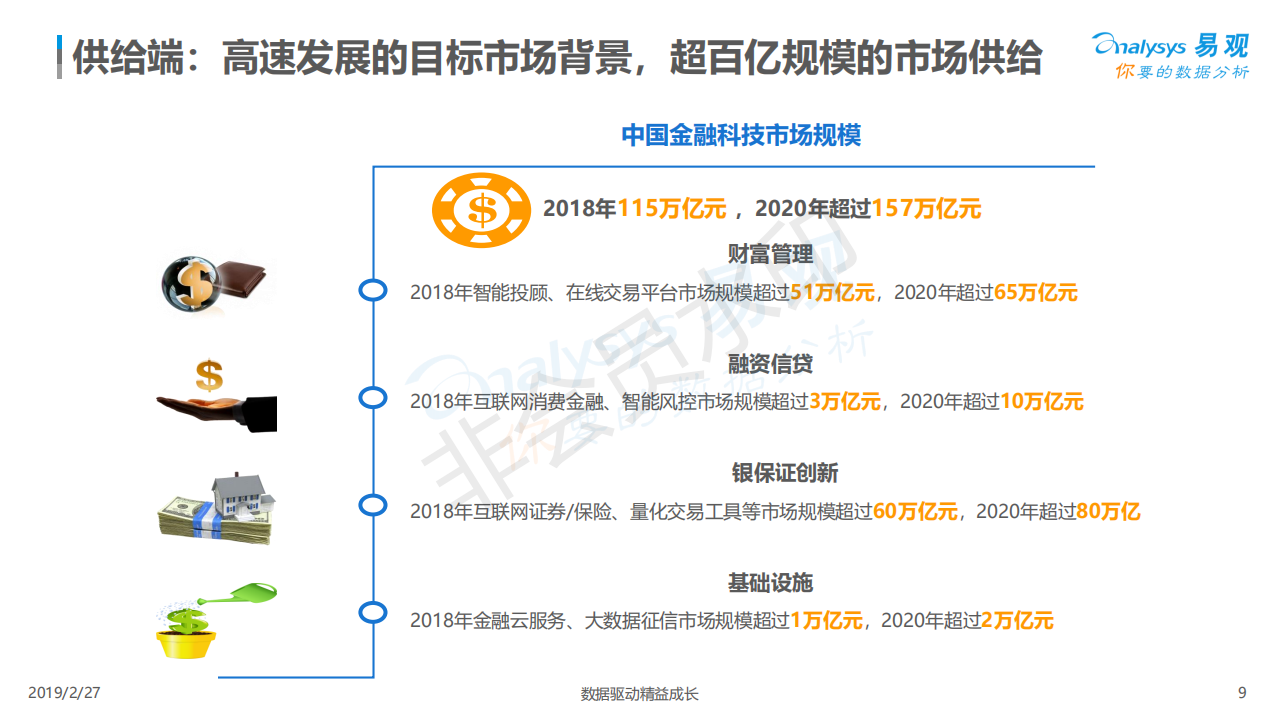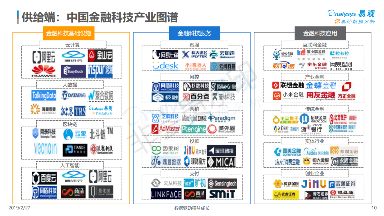 2019年2月27日,易觀發(fā)布了《中國金融科技專題分析 2019》的分析報(bào)告。隨著金融科技的快速發(fā)展,大數(shù)據(jù)、云計(jì)算、人工智能、區(qū)塊鏈等新興前沿技術(shù)在金融各個(gè)領(lǐng)域催生變革與創(chuàng)新,對金融行業(yè)發(fā)展產(chǎn)生深遠(yuǎn)的影響。基于此,Analysys易觀聚焦大數(shù)據(jù)、區(qū)塊鏈、云計(jì)算、人工智能等新興前沿技術(shù)創(chuàng)新發(fā)展,洞察對金融市場以及金融服務(wù)業(yè)務(wù)供給產(chǎn)生重大影響的新興業(yè)務(wù)模式、新技術(shù)應(yīng)用、新產(chǎn)品服務(wù)等,并對金融科技產(chǎn)業(yè)的未來趨勢做出預(yù)測。