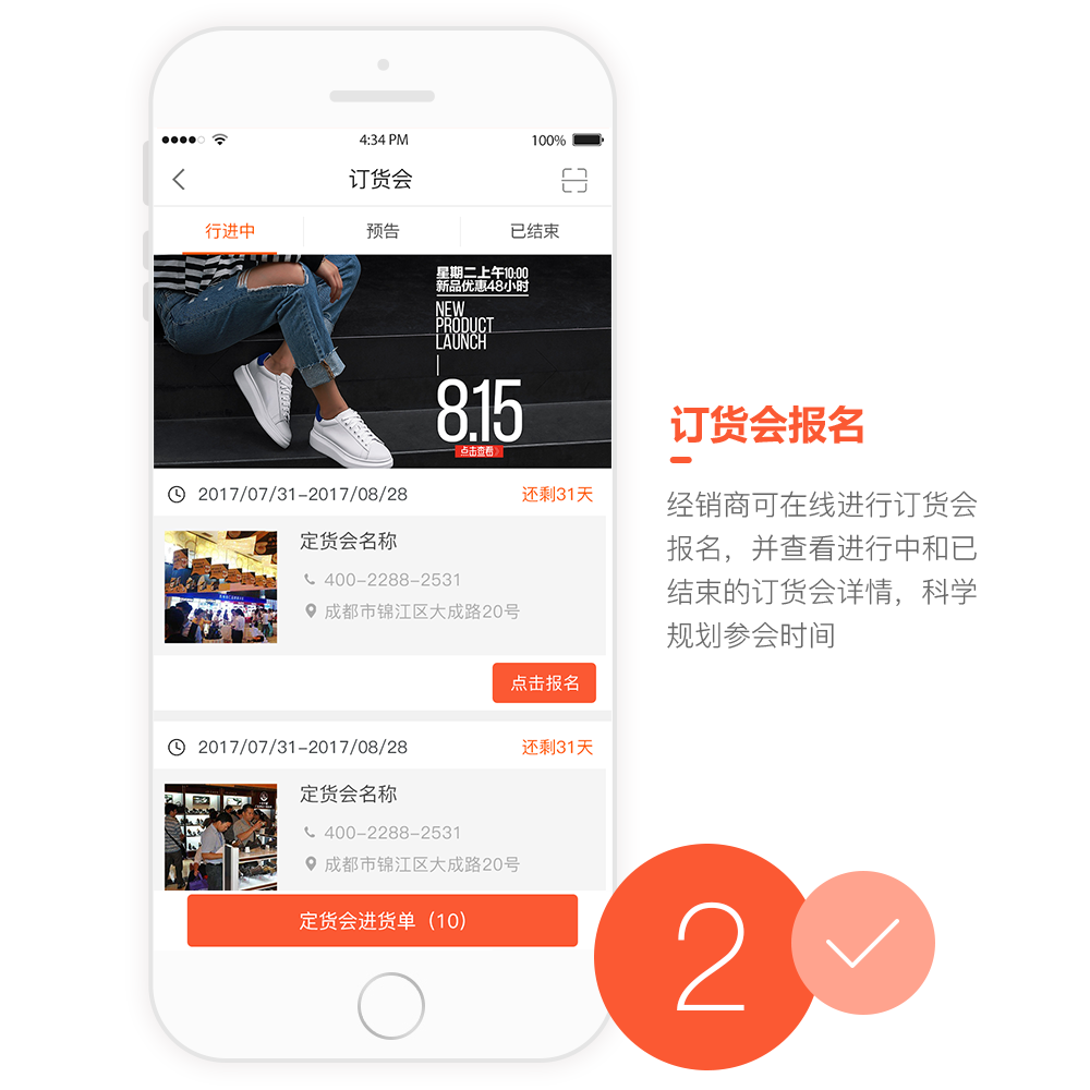 廠商開設內部訂貨會專場,經(jīng)銷商可遠程報名參加,實現(xiàn)線下體驗新品,線上下單訂購的模式,快節(jié)奏的打造一場新品訂貨會。