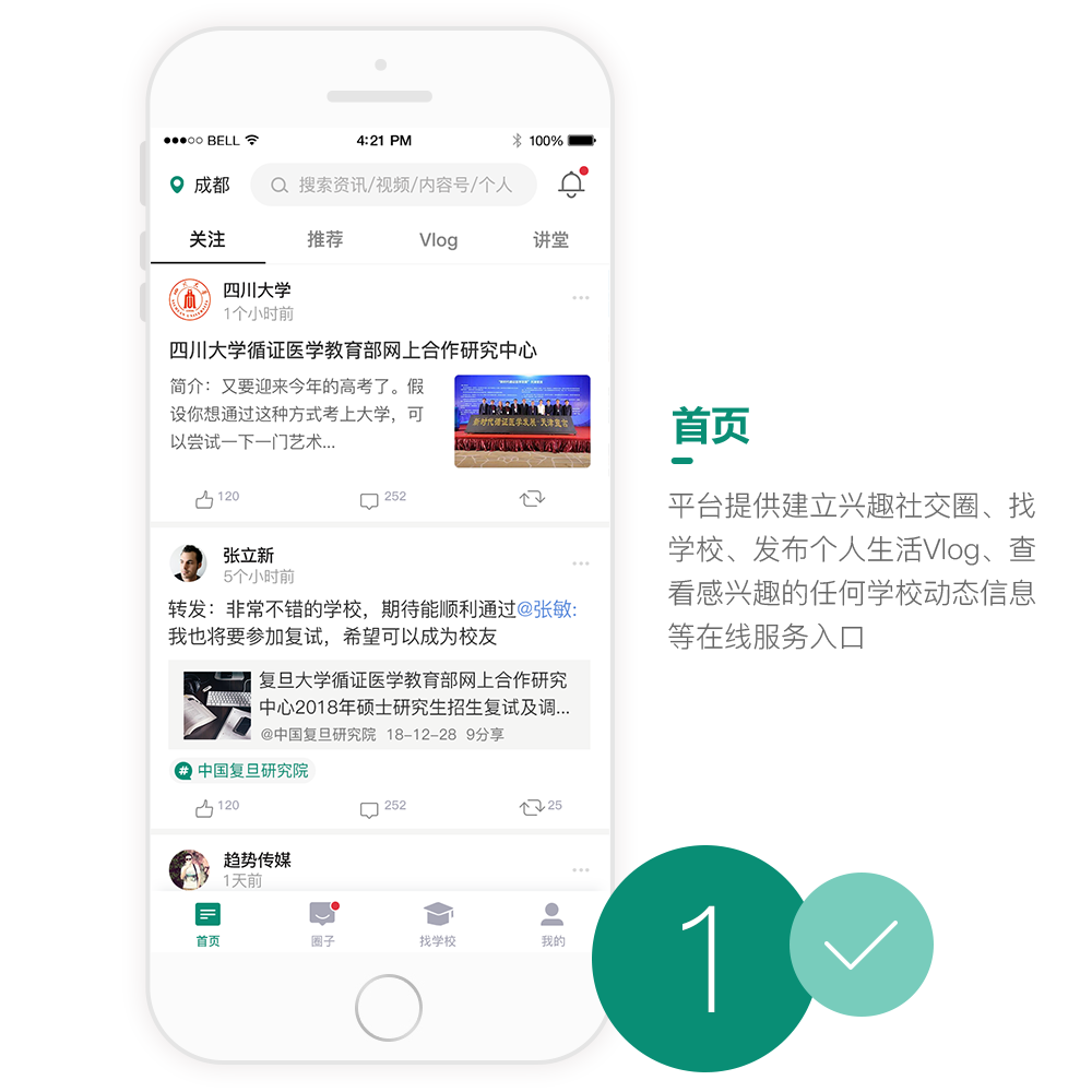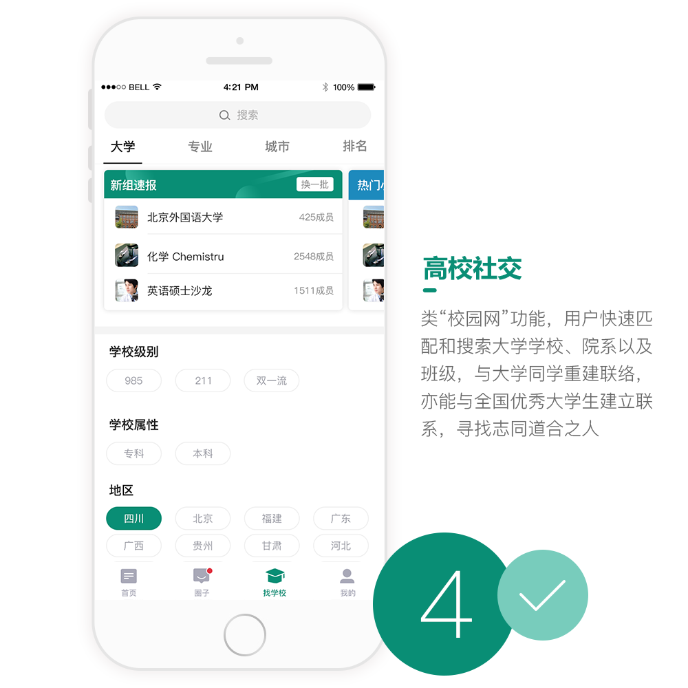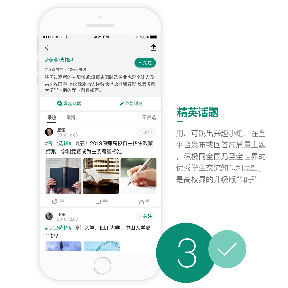 面向國內(nèi)在校及畢業(yè)大學生的校園學習、生活、交友的高端社交平臺,既有“豆瓣”式的創(chuàng)建各類專業(yè)精英興趣小組,還有“知乎”式的高質(zhì)量找答案、看觀點、發(fā)主題,更有“微博”式的記錄精彩生活和關(guān)注熱門人事物,是升級版的“校園網(wǎng)”,為最優(yōu)秀的大學生群體搭建同學聯(lián)絡(luò)、高端社交、激辯交流、思潮陣地的高品質(zhì)精英知識社交平臺。