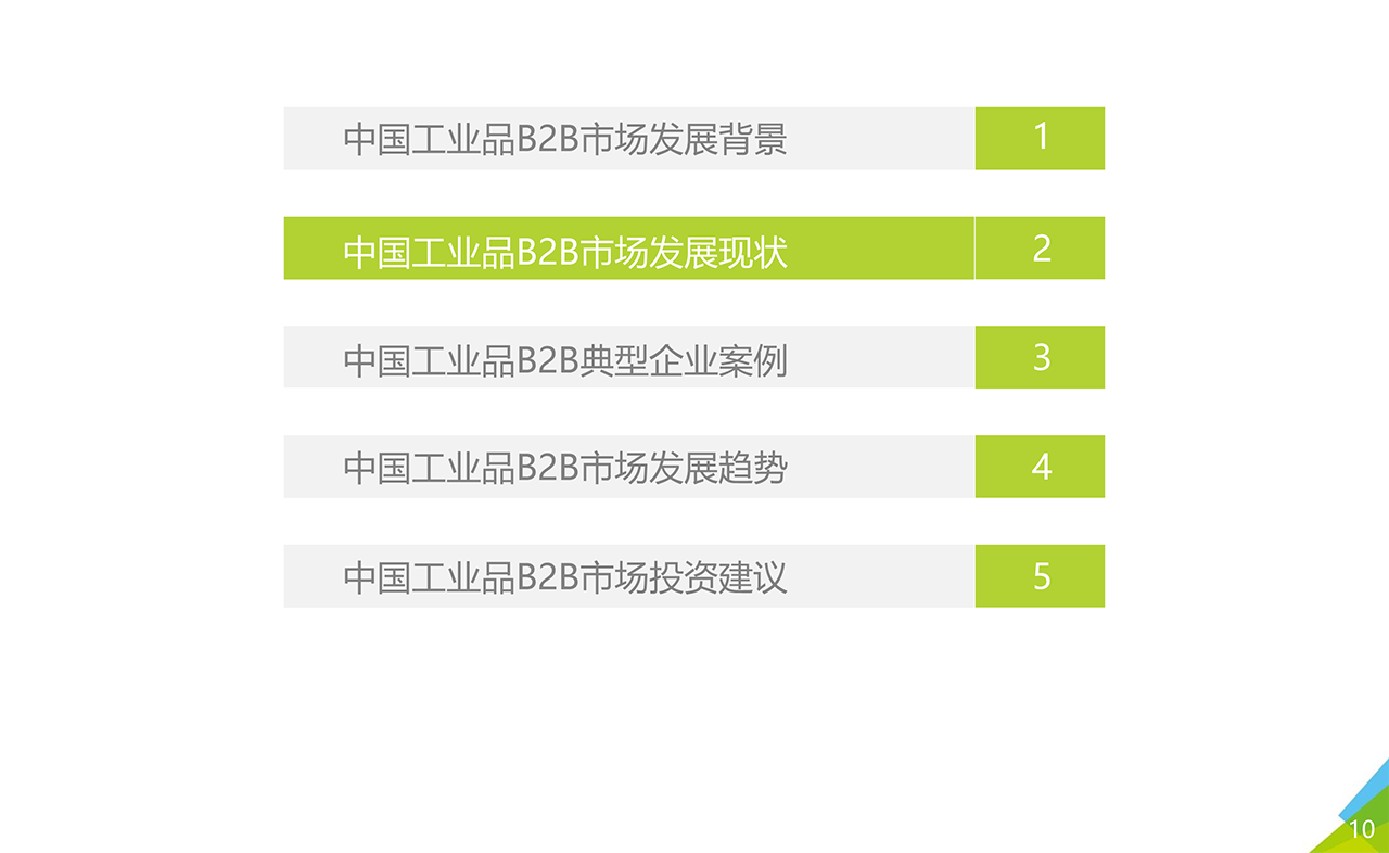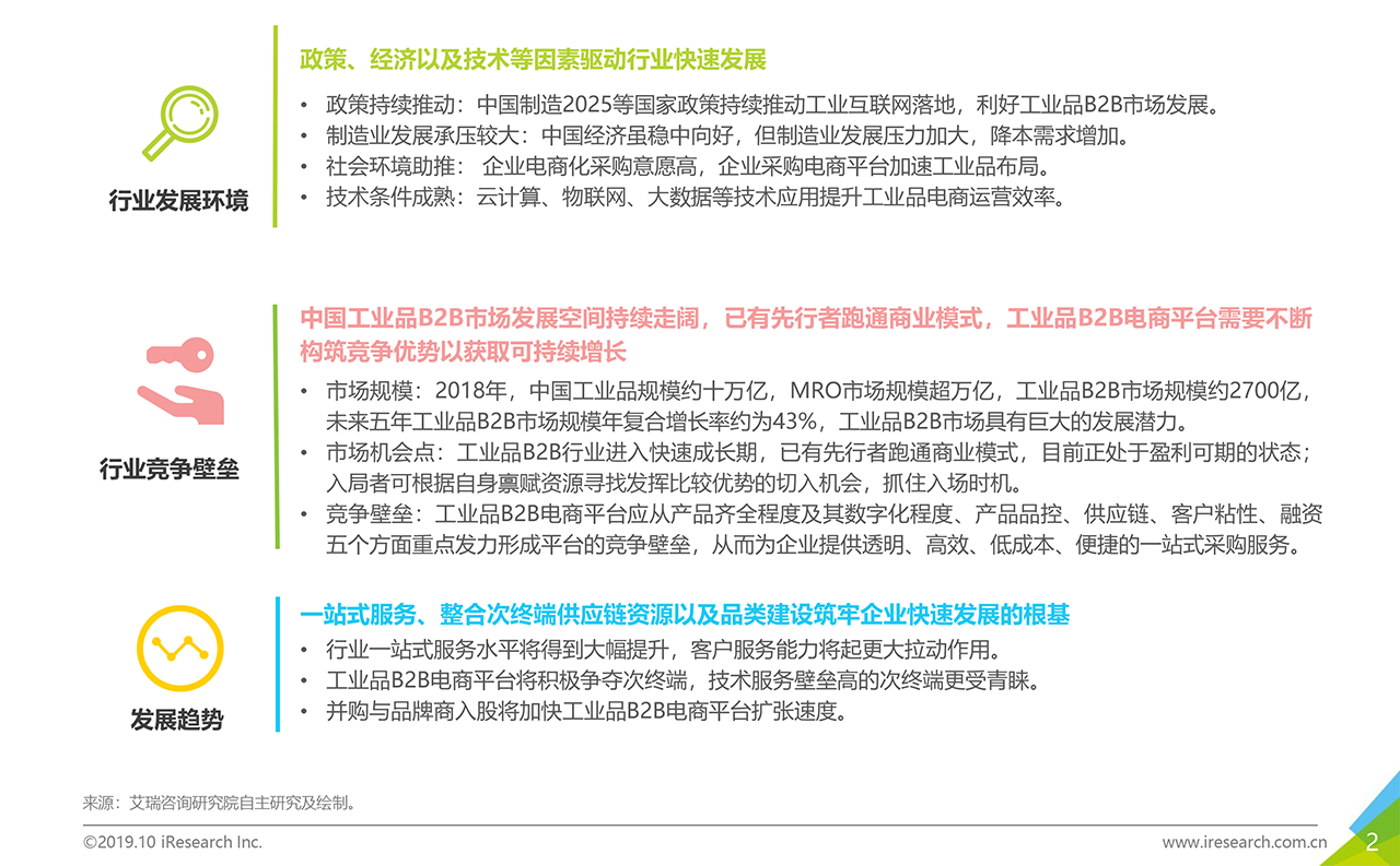 報告下載中國工業(yè)品B2B行業(yè)正處于風(fēng)口期,在中國制造業(yè)加快轉(zhuǎn)型升級以及工業(yè)互聯(lián)網(wǎng)的驅(qū)動下,快速發(fā)展。但中國工業(yè)品B2B行業(yè)整體處于成長階段,面臨諸多發(fā)展問題。為此,本報告從傳統(tǒng)工業(yè)品市場產(chǎn)業(yè)鏈上下游面臨的痛點出發(fā),梳理行業(yè)發(fā)展邏輯及業(yè)務(wù)特性,分析行業(yè)發(fā)展現(xiàn)狀,判斷行業(yè)發(fā)展的趨勢和機會空間,并針對行業(yè)下一階段發(fā)展的關(guān)鍵問題,提出策略性建議。