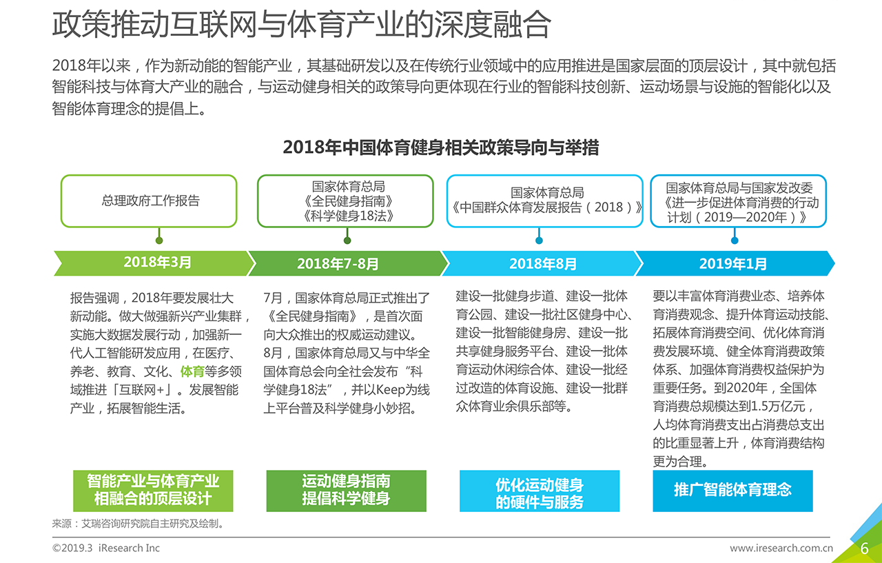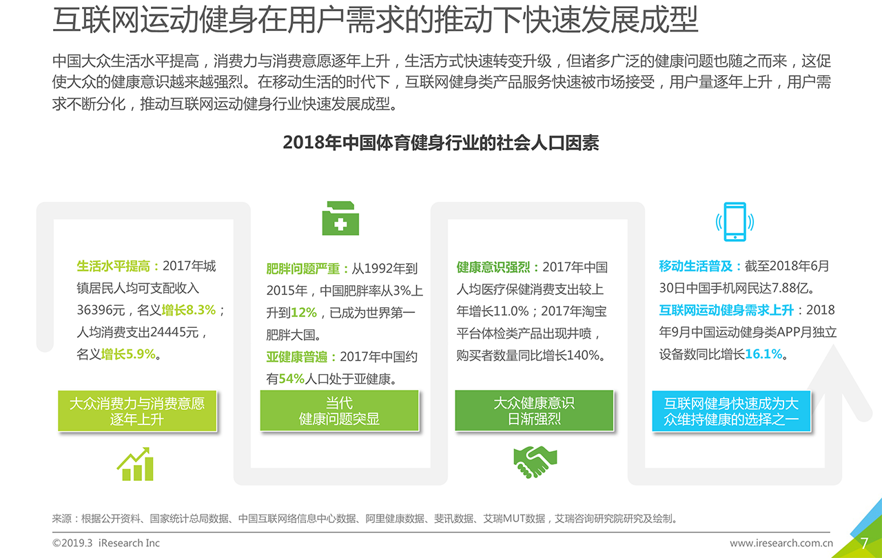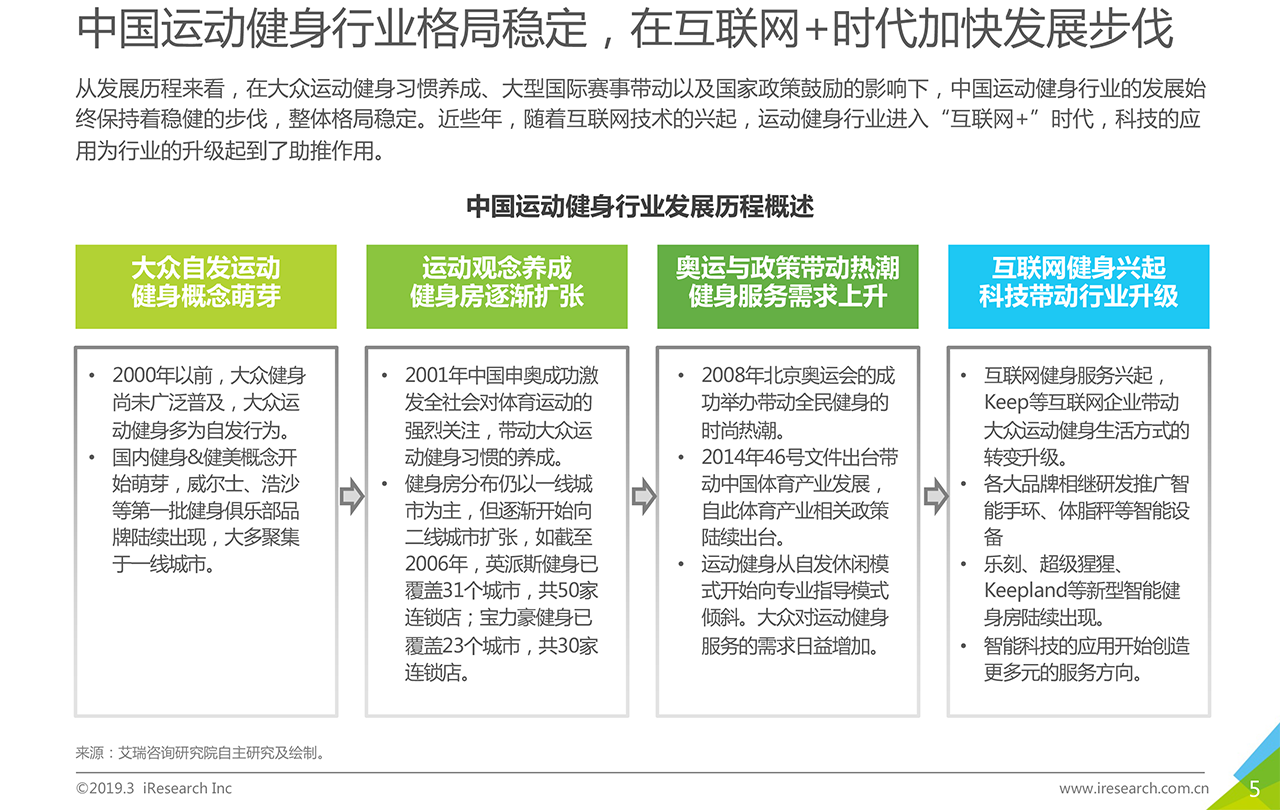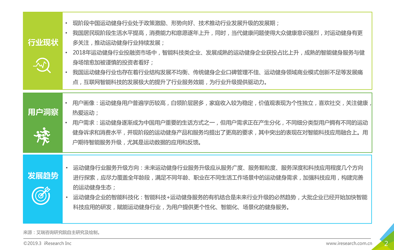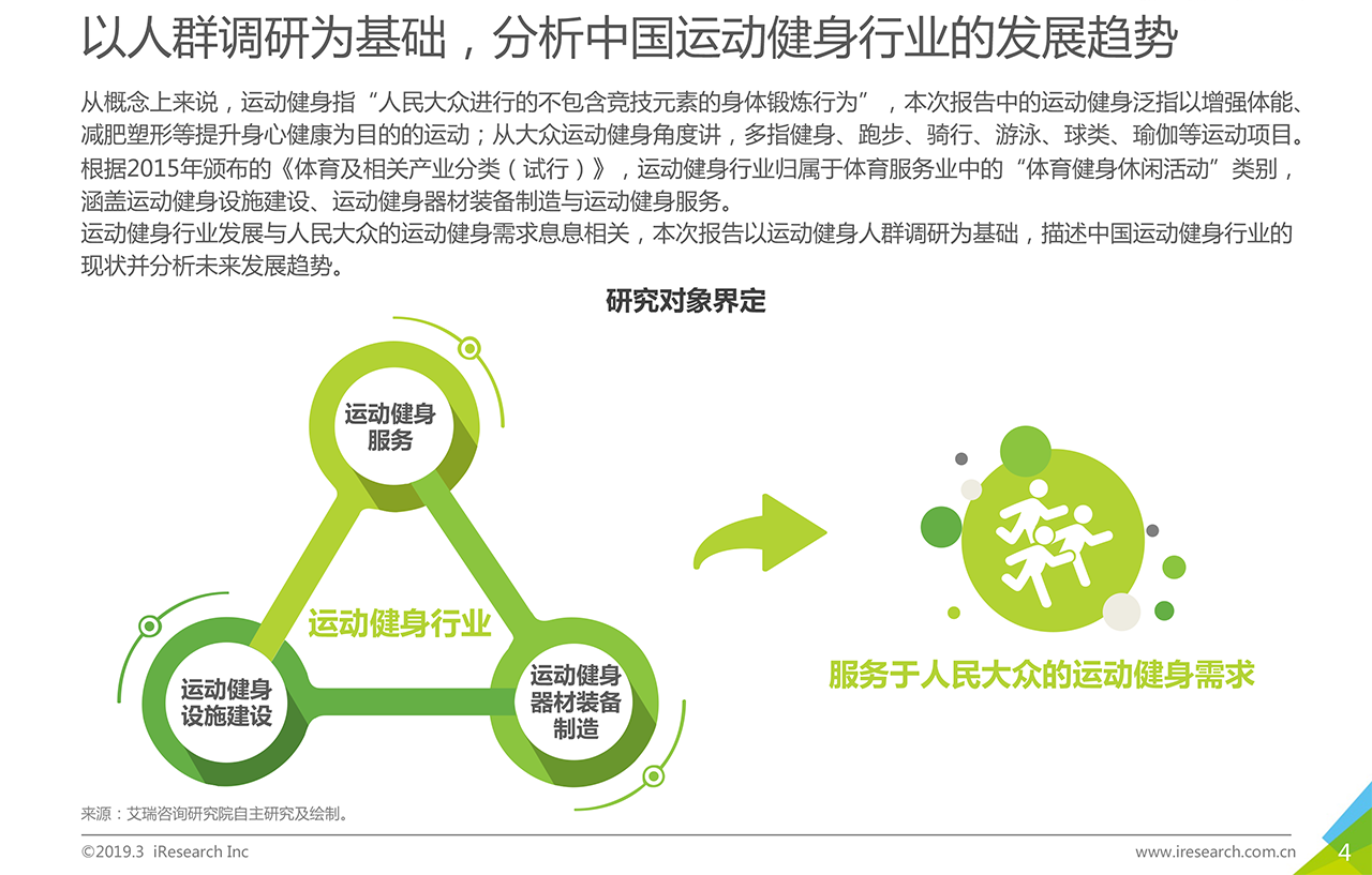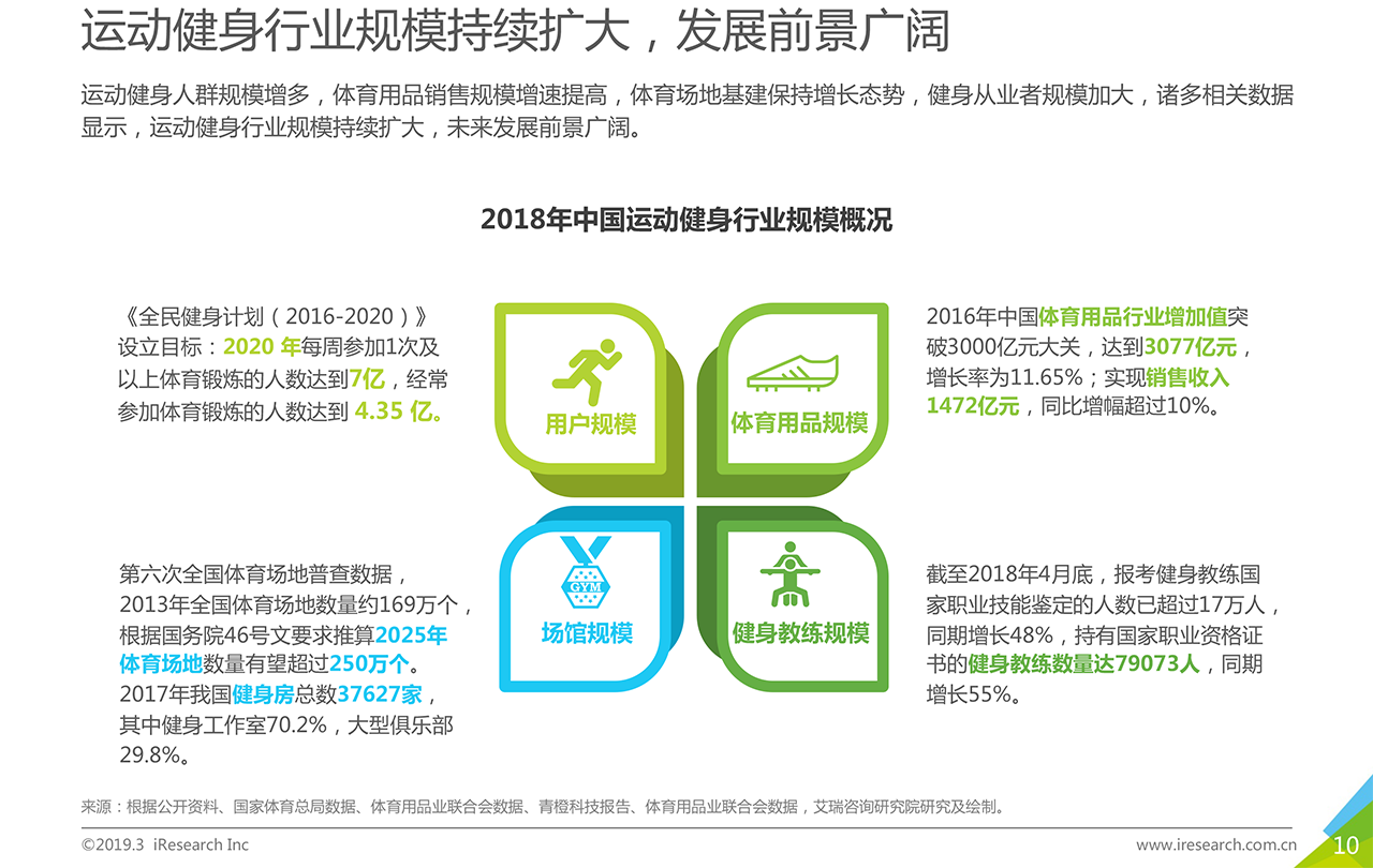 報告下載? ?運動健身行業(yè)在政策鼓勵,大眾生活水平提升,健康意識提高的背景下,整體發(fā)展向好。2018年,傳統(tǒng)健身企業(yè)發(fā)展相對穩(wěn)定,資本看好穩(wěn)健型運動健身企業(yè)以及結(jié)合智能科技元素的新型運動健身企業(yè)。本報告以運動健身行業(yè)作為主要研究對象,描述并探討運動健身行業(yè)發(fā)展背景、現(xiàn)狀特點、產(chǎn)業(yè)鏈、商業(yè)模式,通過對運動健身人群的深入調(diào)研,探索其對運動健身場景、服裝設(shè)備、課程服務(wù)的服務(wù)需求,為未來行業(yè)服務(wù)升級提供發(fā)展建議。