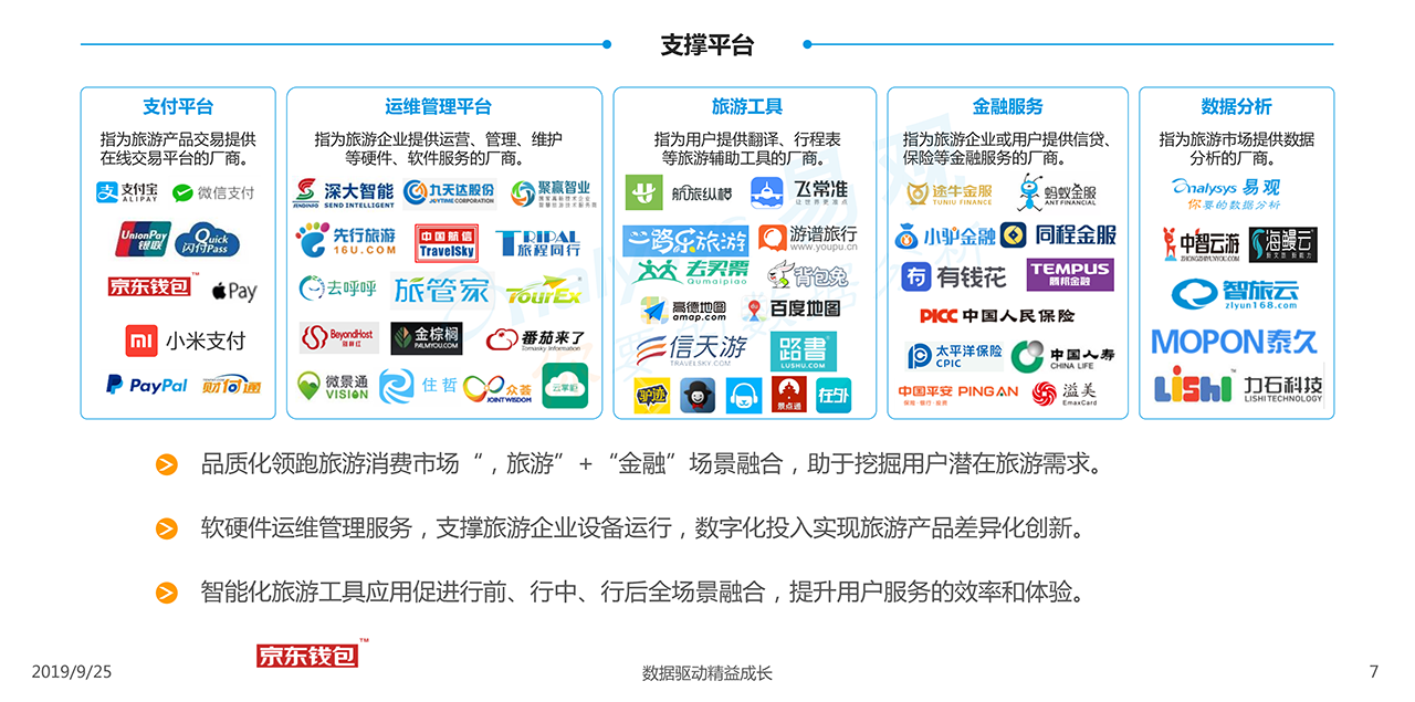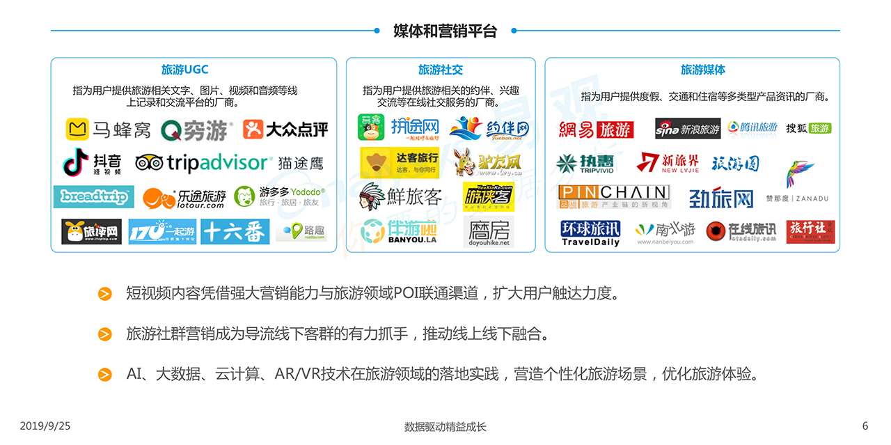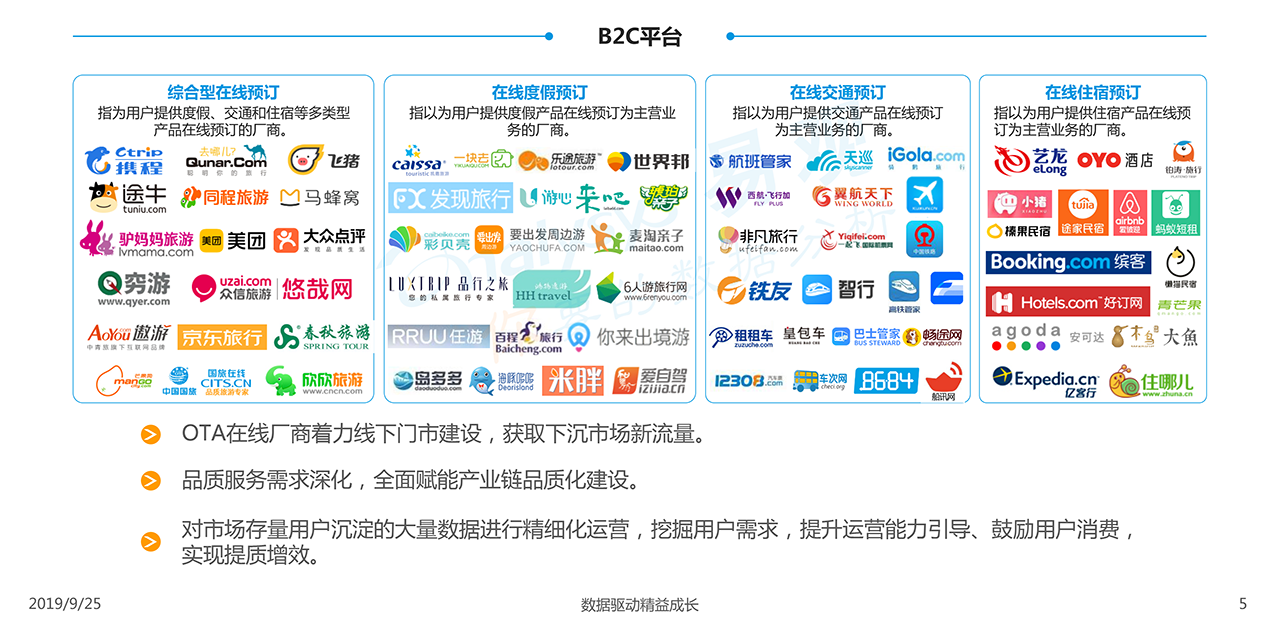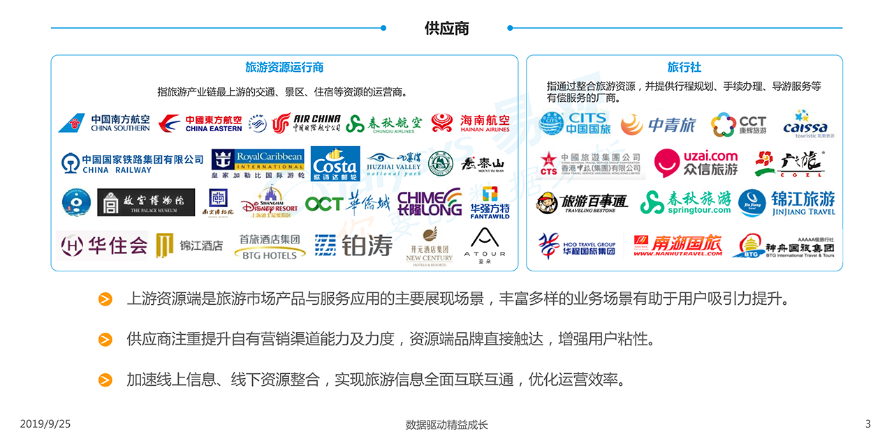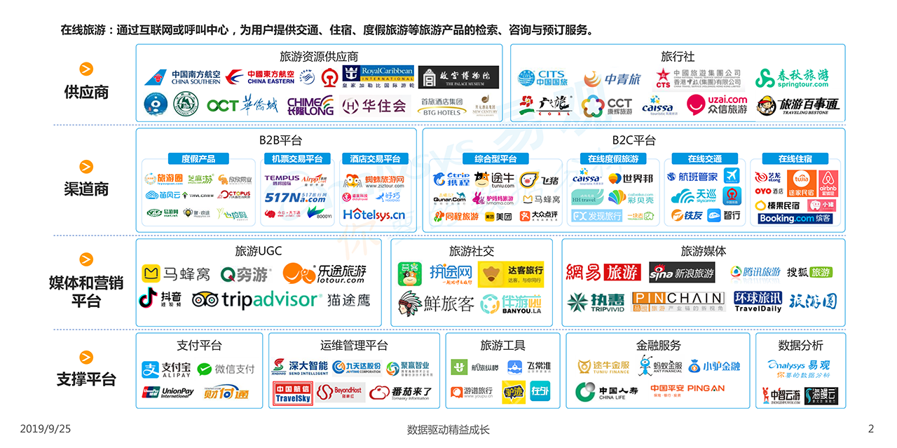 報告下載2019年9月16日,發(fā)布《中國在線旅游市場生態(tài)圖譜2019》的生態(tài)圖譜。報告對在線旅游產(chǎn)業(yè)鏈進行綜合梳理,從供應商、渠道商、媒體和營銷平臺、支撐平臺等四個方面進行總結與分析。在線旅游市場的發(fā)展依賴于各環(huán)節(jié)的共同推進,上游供應商發(fā)力自有渠道建設,渠道端TO B、TO C資源環(huán)節(jié)打通,驅動數(shù)字化運營,營銷層面,短視頻、社交應用參與其中,同時隨著支撐平臺智能化應用落地,旅游服務效率得到提升。未來數(shù)字化進程步伐加快,在線旅游市場開始邁進全產(chǎn)業(yè)鏈精細化運營階段。