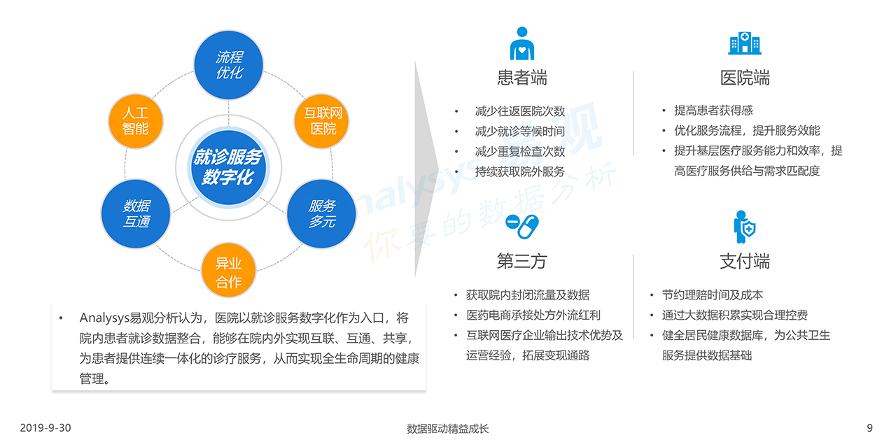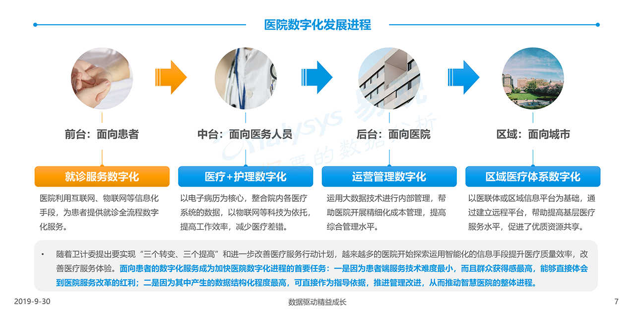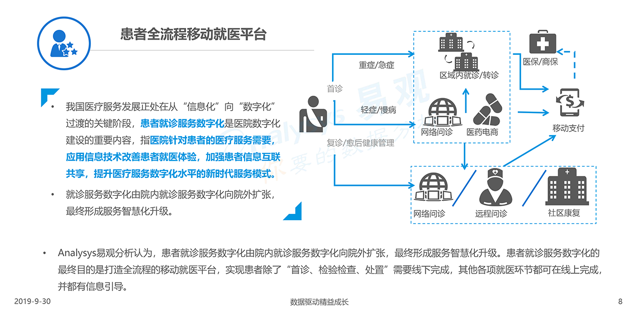 報告下載針對以醫(yī)院為主體,面向患者的就診服務(wù)數(shù)字化進(jìn)行分析,指醫(yī)院利用互聯(lián)網(wǎng)、物聯(lián)網(wǎng)等信息化手段,為患者提供就診全流程數(shù)字化服務(wù),使醫(yī)療服務(wù)流程更便捷、更高效。就診服務(wù)數(shù)字化由院內(nèi)就診服務(wù)數(shù)字化向院外擴(kuò)張,最終形成服務(wù)智慧化升級。患者就診服務(wù)數(shù)字化的最終目的是打造全流程的移動就醫(yī)平臺,實(shí)現(xiàn)患者除了“首診、檢驗(yàn)檢查、處置”需要線下完成,其他各項(xiàng)就醫(yī)環(huán)節(jié)都可在線上完成,并都有信息引導(dǎo)。