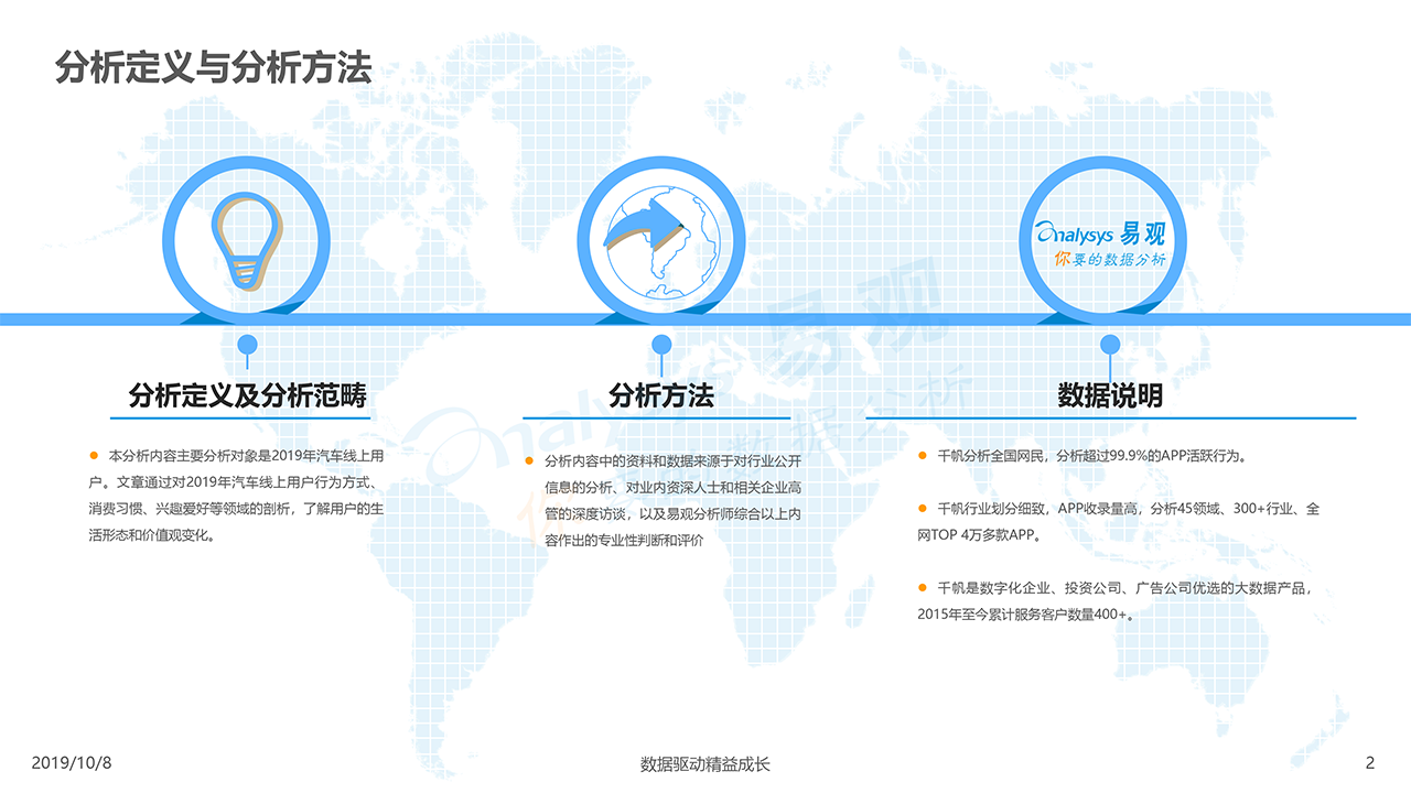 本分析內(nèi)容主要分析對(duì)象是2019年汽車線上用戶。文章通過對(duì)2019年汽車線上用戶行為方式、消費(fèi)習(xí)慣、興趣愛好等領(lǐng)域的剖析,了解用戶的生活形態(tài)和價(jià)值觀變化。