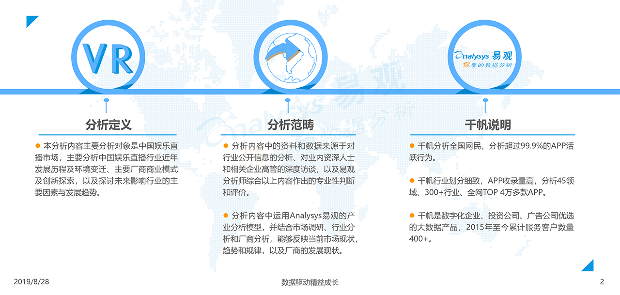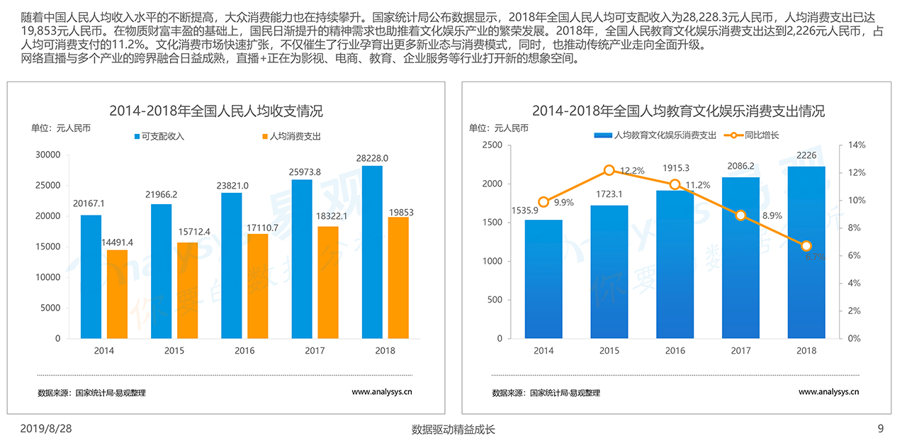 報(bào)告下載2019年8月28日,易觀發(fā)布了《2019年中國(guó)娛樂(lè)直播市場(chǎng)年度綜合分析》的分析報(bào)告。隨著中國(guó)人民人均收入水平的不斷提高,大眾消費(fèi)能力也在持續(xù)攀升。國(guó)家統(tǒng)計(jì)局公布數(shù)據(jù)顯示,2018年全國(guó)人民人均可支配收入為28,228.3元人民幣,人均消費(fèi)支出已達(dá)19,853元人民幣。在物質(zhì)財(cái)富豐盈的基礎(chǔ)上,國(guó)民日漸提升的精神需求也助推著文化娛樂(lè)產(chǎn)業(yè)的繁榮發(fā)展。2018年,全國(guó)人民教育文化娛樂(lè)消費(fèi)支出達(dá)到2,226元人民幣,占人均可消費(fèi)支付的11.2%。文化消費(fèi)市場(chǎng)快速擴(kuò)張,不僅催生了行業(yè)孕育出更多新業(yè)態(tài)與消費(fèi)模式,同時(shí),也推動(dòng)傳統(tǒng)產(chǎn)業(yè)走向全面升級(jí)。 網(wǎng)絡(luò)直播與多個(gè)產(chǎn)業(yè)的跨界融合日益成熟,直播+正在為影視、電商、教育、企業(yè)服務(wù)等行業(yè)打開(kāi)新的想象空間。