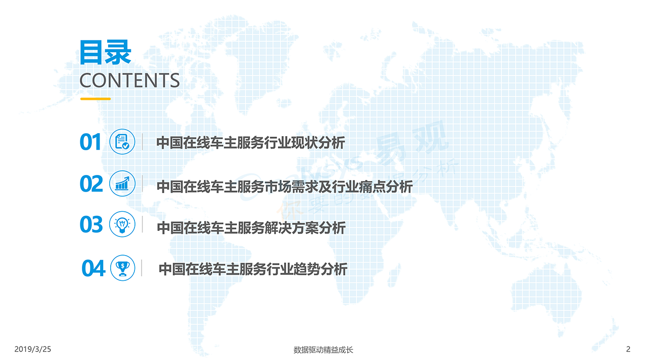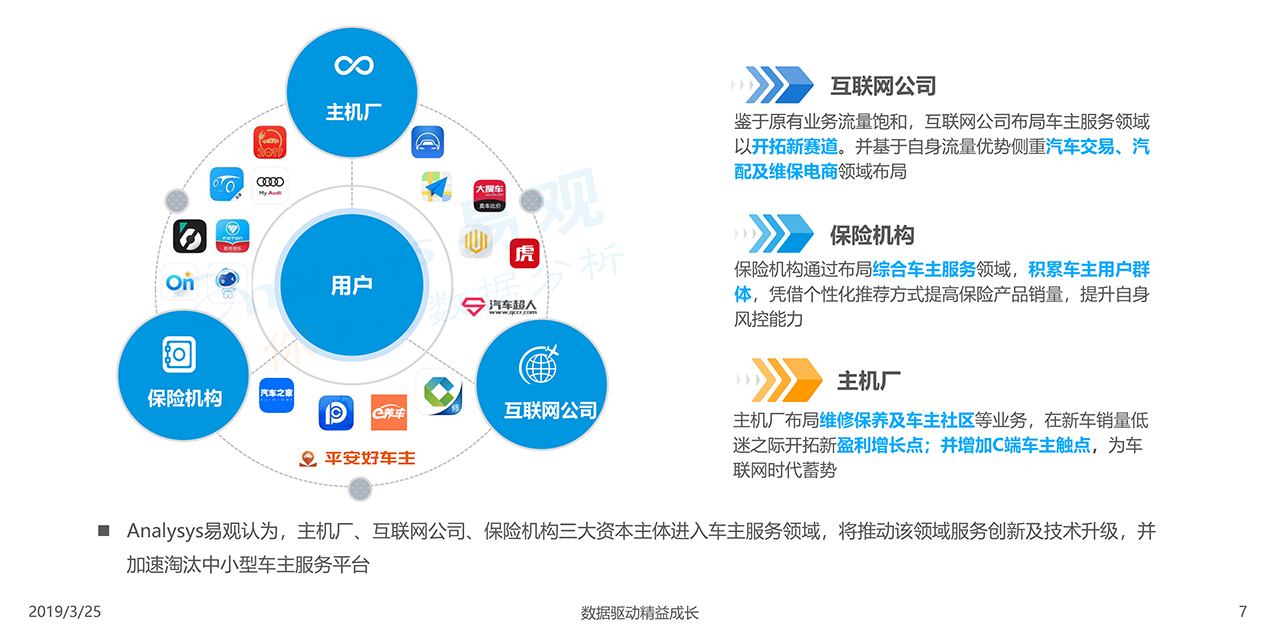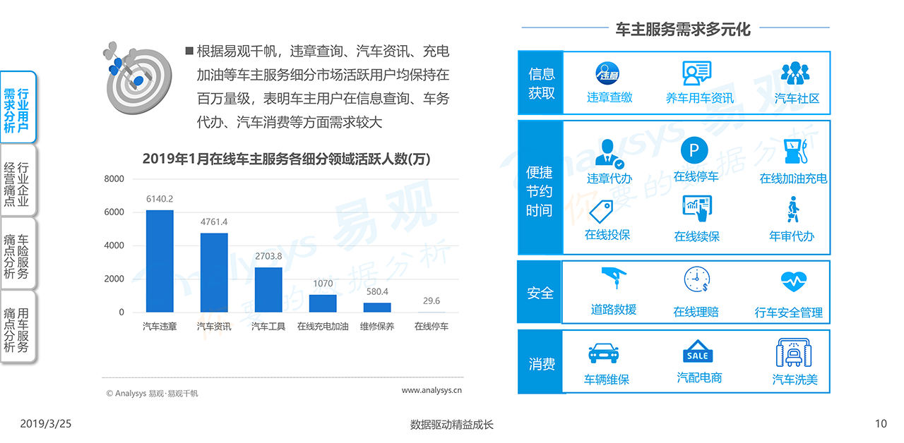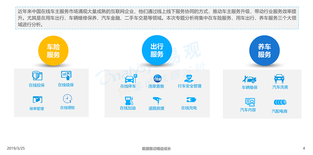 報(bào)告下載2019年3月22日,易觀發(fā)布了《2019年中國(guó)在線車主服務(wù)白皮書》。該分析指出目前我國(guó)車主服務(wù)行業(yè)仍存在信息不對(duì)稱、服務(wù)體驗(yàn)差、價(jià)格不合理、時(shí)間成本高等痛點(diǎn)。而線上車主服務(wù)平臺(tái)通過線上與線下服務(wù)協(xié)同打通,為用戶提供更加便捷、優(yōu)質(zhì)的服務(wù)。本分析將從車險(xiǎn)服務(wù)、用車服務(wù)、養(yǎng)車服務(wù)三個(gè)細(xì)分維度出發(fā),首先指出車主服務(wù)市場(chǎng)需求變化、競(jìng)爭(zhēng)格局、及行業(yè)內(nèi)用戶及企業(yè)存在的普遍痛點(diǎn),并提出相關(guān)解決方案,并在最后對(duì)行業(yè)發(fā)展趨勢(shì)做出展望。